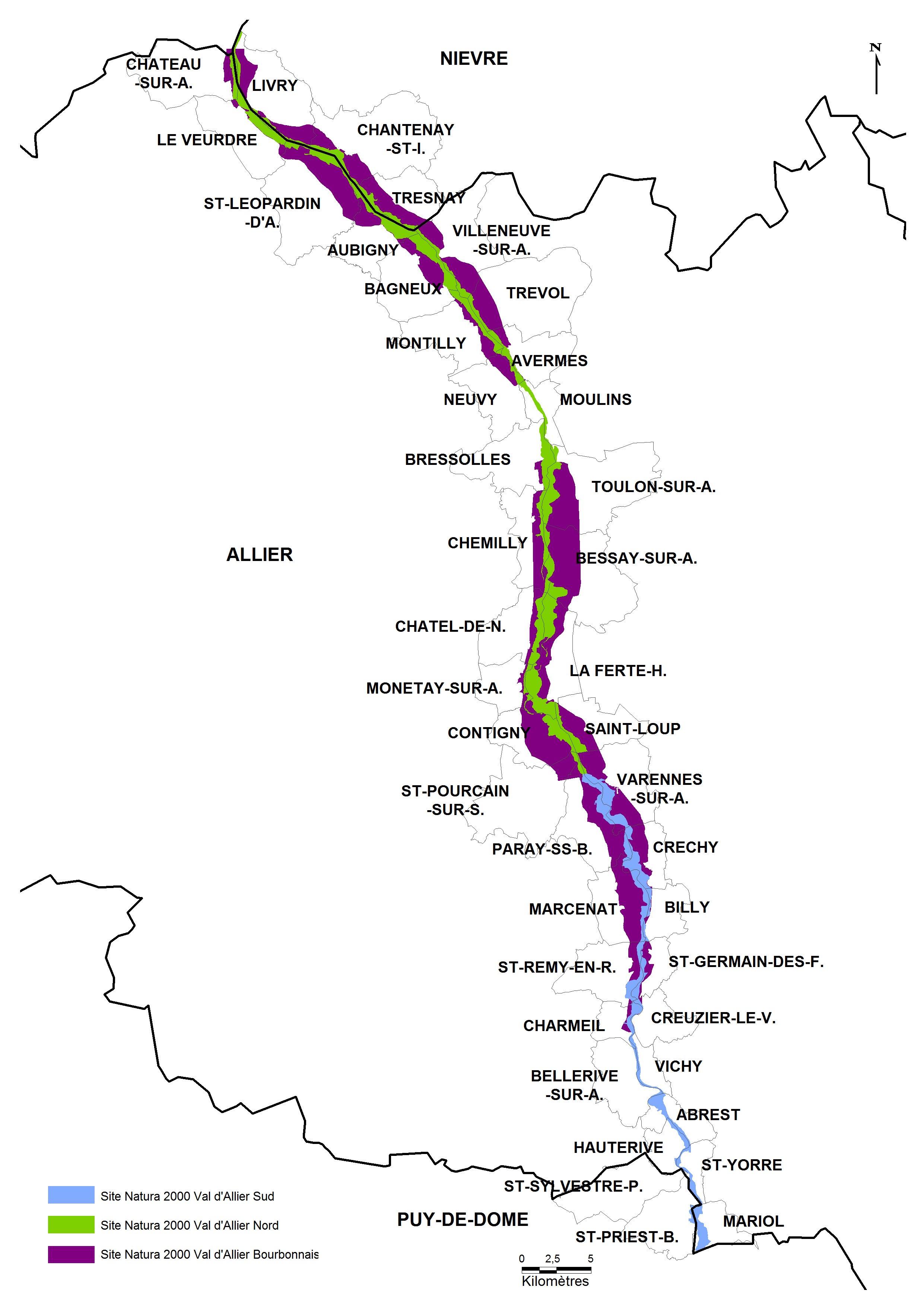 Allier (23 communes) : Aubigny, Avermes, Bagneux, Bessay-sur-Allier, Bressolles, Château-sur-Allier, Châtel-de-Neuvre, Chemilly, Contigny, La Ferté-Hauterive, Monétay-sur-Allier, Montilly, Moulins, Paray-sous-Briailles, Neuvy, Saint-Lépoardin d’Augy, Saint-Loup, Saint-Pourçain-sur-Sioule, Toulon-sur-Allier, Trévol, Varennes-sur-Allier, Le Veurdre, Villeneuve-sur-Allier.
